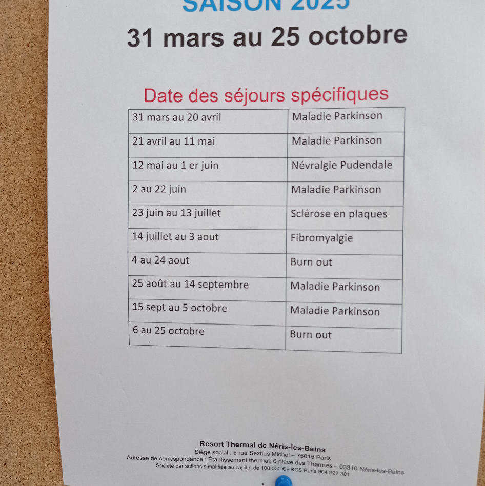 Dans le prolongement de l’article sur le séjour d’André et Pierrette Aubert et d’un article (https://www.assoffgp.fr/wp-content/uploads/la-page-147-imprimerie.pdf ) sur les bénéfices des cures thermales pour les patients Parkinson, l’association a organisé le 13 juin dernier un déplacement à Néris les Bains pour découvrir de visu la ville, les installations et le déroulé d’une cure pour les adhérents qui souhaitaient s’informer.